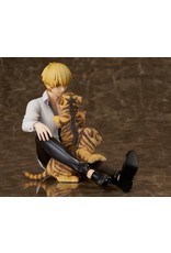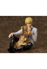 From "Fate/EXTELLA Link" comes a non-scale figure of Gilgamesh! He comes sitting in a relaxed pose, with his white button-up shirt undone in the front for a casual appearance. His smile is soft as he plays with the small cubs in his lap, a big change from the Gilgamesh we usually see in figure form!
