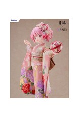 She is posed with her head tilted back and smiling, giving off a cute Madoka-like quality. She is posed with her legs crossed so that even though she is standing, you can feel her movement. The pearl painted ball and hair ornament are also sculpted in detail and painted in the same color as the kimono, creating a sense of unity.